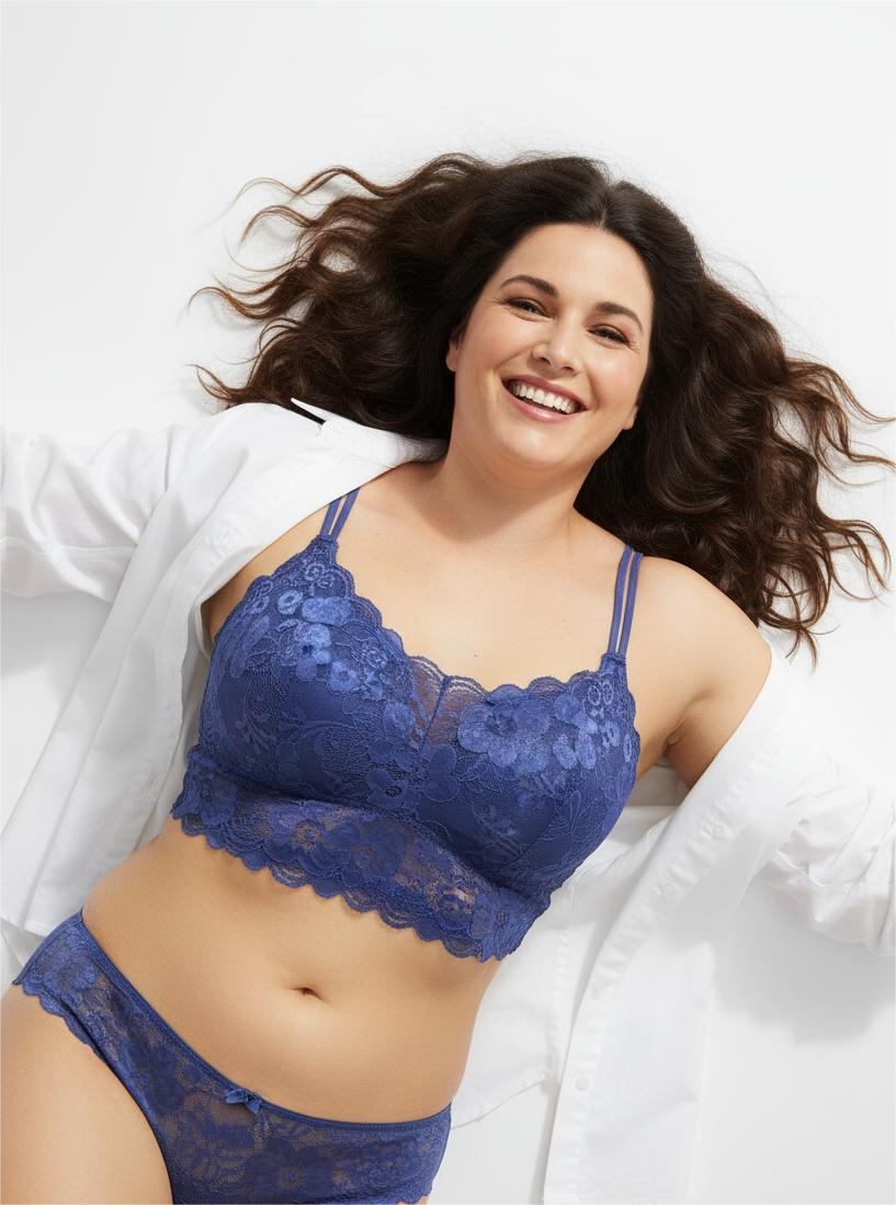 Elevate your lingerie drawer with this stunning Indigo Blue Lace Bralette and Panty Set. Designed for comfort and versatility, this wire-free bralette features a beautiful longline cut and an exquisite scalloped edge, offering a soft, flattering fit. The rich deep blue lace provides a gorgeous texture that’s perfect for layering under sheer tops or wearing as a fashionable foundation piece under an open shirt or jacket. Experience the luxurious feel of stretch lace that supports and contours without restriction, making you feel confident and beautiful, day or night.
