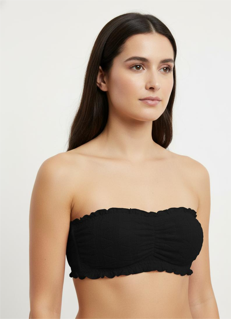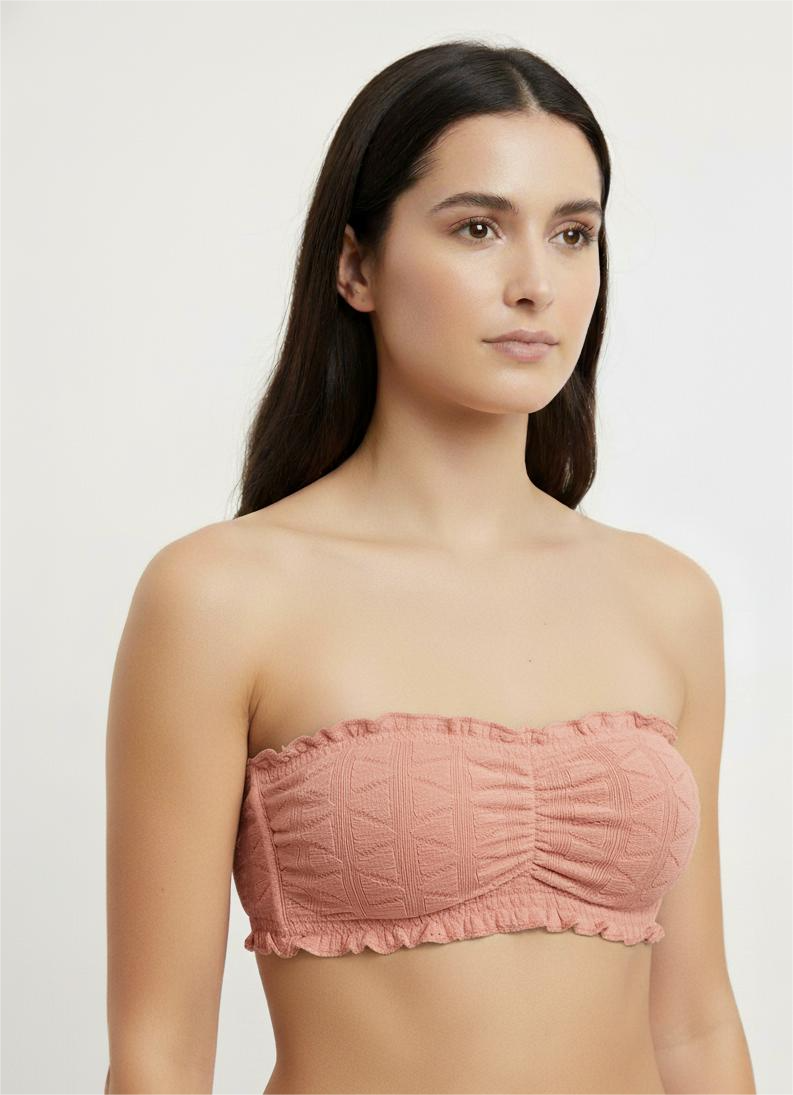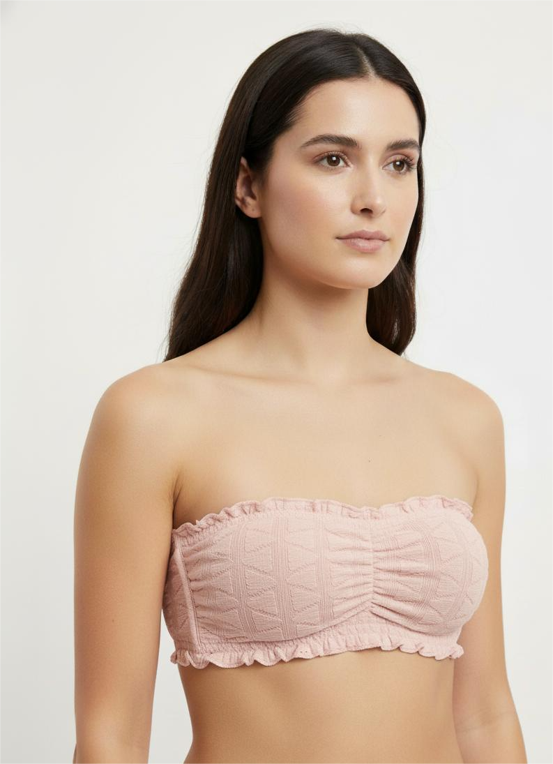 A comfortable and chic strapless option, this Ruched Knit Bandeau Bralette in a cool grey shade is a must-have for summer layering and loungewear. The all-over textured knit with a subtle geometric pattern adds visual interest, while the gathering (ruching) at the bust provides gentle shaping and a flattering look. The delicate, ruffled edges along the neckline and hem complete the sweet, feminine design.